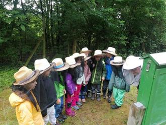 Dann führte der Imker die Kinder zu den Bienenstöcken, wo sie hunderte von Bienen emsig in einem Show- Kasten arbeiten sahen. Die Kinder waren fasziniert von dem Summen der Bienen und beobachteten gespannt, wie sie Nektar sammelten und in den Stock brachten.