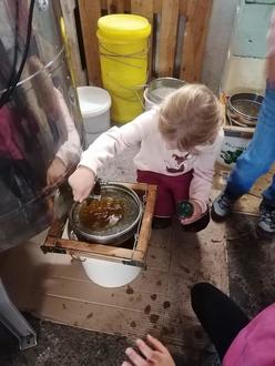 Anschließend durften die Kinder selbst Hand anlegen und die Propolis von den Waben kratzen. Der weiße Belag auf den Waben wird als „Propolis“ bezeichnet und wird von den Bienen produziert. Propolis besteht aus Harzen, Pollen und Wachs und dient den Bienen dazu, den Bienenstock abzudichten und vor Krankheiten zu schützen. Nachdem die Waben von den Kindern gereinigt waren, durften sie helfen, die Waben in die Schleudermaschine zu stecken. Mit strahlenden Augen beobachteten sie, wie der Honig aus den Waben geschleudert wurde und in einen Behälter floss.
