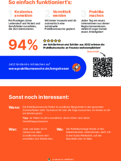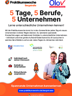 In der Praktikumswoche haben junge Bergsträßerinnen und Bergsträßer die Möglichkeit, an 5 selbst ausgewählten Tagen innerhalb der Sommerferien jeden Tag ein Unternehmen und neue Berufe kennenzulernen. Der Organisationsaufwand wird durch eine digitale und smarte Vermittlungsplattform auf ein Minimum begrenzt. So können sich die Unternehmen auf das persönliche Kennenlernen der Schülerinnen und Schüler konzentrieren und die Jugendlichen die berufliche Erfahrungen sammeln. Die Teilnahme für Unternehmen sowie Praktikantinnen und Praktikanten ist kostenlos.