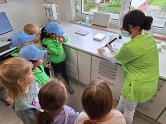 Das Zahnarztteam, unter der Leitung von Fr. Lannert, erklärte den kleinen Besuchern, wie man die Zähne gesund erhalten kann und warum es so wichtig ist, regelmäßig die Zähne zu putzen, dass es Nahrung gibt, die Zähne krank machen kann, oder Lebensmittel, die Zähne gesund erhalten können. Rollenspiele eigenen sich bestens zum Begreifen und Verstehen von Zusammenhängen. So durfte jedes Kind einmal selbst in die Rolle des Arztes, der Assistentin oder des Patienten schlüpfen.
