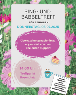 Das Organisationsteam um Ilona und Egon Ruppert erinnert nochmals an den nächsten „Sing- und Babbeltreff“ der Abtsteinacher Seniorinnen und Senioren. Dieser findet am Donnerstag, dem 03. Juli statt. Treffpunkt ist um 14 Uhr auf dem Rosenplatz vor dem Betreuten Wohnen. An diesem Tag wartet eine weitere Überraschung auf den Teilnehmerkreis, mehr wird dazu aber noch nicht verraten.