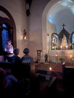 Nach dem Auftritt der „Zwei Grazien“, die gleich weiter zum nächsten Veranstaltungsort eilten, übernahmen die beiden Musiker Sebastian Strodtbeck und Jürgen „Mojo“ Schultz und unterhielten die Gäste aus Nah und Fern. Pausiert wurde nur, wenn eine Führung von Uwe Schork in der Kapelle stattfand. „Das war richtig interessant, diese Legende von der Marienstatue, die mehrfach verschwunden war!“ sagte eine Besucherin beim Verlassen der Kapelle. Familie Schork liegt die Kapelle am Herzen, weshalb sie sich auch in diesem Jahr erneut liebevoll um Dekoration, Beleuchtung und die stimmige Hintergrundmusik gekümmert hat.