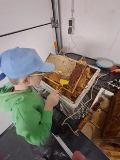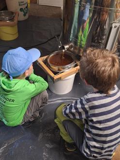 Anschließend durften die Kinder selbst Hand anlegen und die Propolis von den Waben kratzen. Der weiße Belag auf den Waben wird als „Propolis“ bezeichnet und wird von den Bienen produziert. Propolis besteht aus Harzen, Pollen und Wachs und dient den Bienen dazu, den Bienenstock abzudichten und vor Krankheiten zu schützen. Nachdem die Waben von den Kindern gereinigt waren, durften sie helfen, die Waben in die Schleudermaschine zu stecken. Mit strahlenden Augen beobachteten sie, wie der Honig aus den Waben geschleudert wurde und in einen Behälter floss.