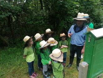 Dann führte der Imker die kleinen Gäste zu den Bienenstöcken, wo sie hunderte von Bienen emsig in einem Show- Kasten arbeiten sahen. Die Kinder waren fasziniert von dem Summen der Bienen und beobachteten gespannt, wie sie Nektar sammelten und in den Stock brachten.