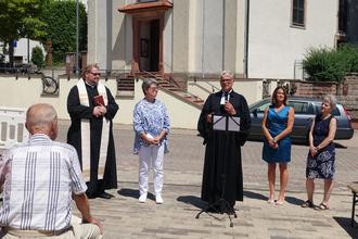 Vor der Namensenthüllung durch Angelika Beckenbach und Karin Oberle segneten Pfarrer Michas, Pfarrer Rothermel und Martina Mohr den Platz.