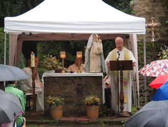Bei der Wallfahrt nach Lichtenklingen war in diesem Jahr vieles anders. Auf Grund der verschiedenen Einschränkungen in den Wäldern in Folge der Schweinepest konnte aber mit der zuständigen Behörde des Kreises Bergstraße eine Übereinkunft getroffen werden. Infolgedessen wurde weder die Prozession zum Lichtenklinger Hof noch der Gottesdienst in der Ruine durch die Katholische Kirchenmusik Ober-Abtsteinach musikalisch begleitet. Zusätzlich fiel auch die gesamte Bewirtung der Pilger den Beschränkungen zum Opfer. Da auch die Wetterprognosen für diesen Sonntagvormittag alles andere als gut waren, hatte das Organisationsteam entschieden, die Marienfigur nicht mit der Prozession mitzuführen, sondern vorab nach Lichtenklingen zu bringen. So war es eine sehr stille Wallfahrt, die von Pfarrer Alexander Rothermel geleitet wurde. Glücklicherweise war das Wetter aber deutlich besser als befürchtet und erst zur Predigt setzte leichter Regen ein. Zum Gottesdienst war die Kapellenruine zwar gut gefüllt, erreichte aber nicht die Besucherzahl vorangegangener Jahre. Pfarrer Rothermel eröffnete den die Heilige Messe. Gemeinsam mit ihm zelebrierten Pfarrer i.R. Ulrich Fahl, Diakon Thomas Fettel und dem aus Ober-Abtsteinach stammenden Pfr. i.R. Leonard Heckmann die Liturgie. Heckmann übernahm auch die Festpredigt. Er ging zunächst kurz auf die Legende der Marienfigur ein, deren Standort zunächst drei Mal auf wundersame Weise zwischen der Kapelle in Unter-Abtsteinach und der Ruine Lichtenklingen wechselte, bevor sie endgültig in Unter-Abtsteinach blieb. Auch führte er aus, dass die Tradition der Prozession nach Lichtenklingen bis auf das Ende des 18 Jahrhunderts zurückgeht. Heckmann leitete dann zu einem weiteren berühmten Marienbild über, das in einer Wallfahrtskirche bei Augsburg steht: Maria Kontenlöserin. An einigen Beispielen zeigte er auf, was sich hinter diesem Begriff verbirgt und wie viele Knoten es im Leben der Menschen gibt, die man durch den Glauben lösen kann. Zum Abschluss des Gottesdienstes bedankte sich Pfarrer Rothermel bei allen Helfern für die Vorbereitung und Durchführung der Wallfahrt und des Gottesdienstes. Ein Dank galt auch den Maltesern aus Abtsteinach, die die Veranstaltung begleiteten. Diakon Thomas Fettel wies noch auf die Männerwallfahrt in die Eifel hin, bei der noch einige wenige Plätze frei sind. Mit der Weihe der Kräutersträuße, im Volksmund auch „Werzbüsch“ genannt, und dem Segen beschloss Pfr. Rothermel den Gottesdienst und die Wallfahrt.