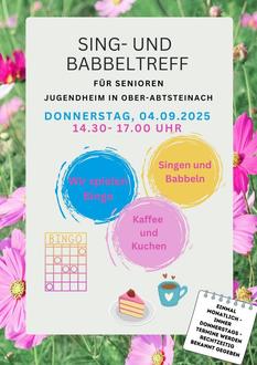 Nach einer kurzen Sommerpause steht nun, am Donnerstag, dem 04. September, der nächste Termin an. Treffpunkt ist dann wieder zur gewohnten Zeit, um 14:30 Uhr, im Katholischen Jugendheim in Ober-Abtsteinach. Dann darf einmal mehr gesungen und gebabbelt werden, außerdem gibt wieder die Möglichkeit, Bingo zu spielen.