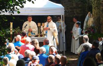 Etwa 230 Pilger nahmen an der diesjährigen Muttergotteswallfahrt nach Lichtenklingen teil. Die Prozession startete um 9.30 Uhr in Siedelsbrunn und führte, unter den Klängen der KKM Ober-Abtsteinach zur knapp 2,5 km entfernten Kirchenruine am Lichtenklinger Hof. Mitgeführt wurde die Marienfigur aus der Kapelle in Unter-Abtsteinach, die der Legende nach aus Lichtenklingen stammen soll. Als Festprediger für den anschließenden Gottesdienst konnte Prof. Dr. Tonke Dennebaum aus Mainz gewonnen werden. Dennebaum ist seit 2023 Leiter des Kommissariats der katholischen Bischöfe in Hessen und somit Vertreter der Belange der hessischen Diözesen bei der Landesregierung, dem Landtag und den politischen Parteien sowie bei den gesellschaftlichen Gruppen und Verbänden auf Landesebene. In seiner Predigt ging er auf die liturgischen Texte vom Tag ein und deutete sie in Bezug auf die Gottesmutter Maria. Zum Abschluss des Gottesdienstes segnet Pfr. Rothermel die Kräutersträuße. Im Anschluss konnten sich die Pilger mit heißer Wurst, kühlen Getränken sowie Kaffee und Kuchen stärken. Zum Abschluss des Wallfahrtstages fanden sich die Wallfahrer nochmals zu einer gemeinsamen Marienandacht ein.