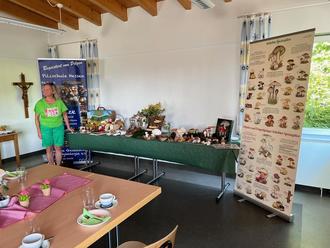 Höhepunkt war zweifellos das Referat der Abtsteinacherin Monika Berbner, ihres Zeichens Pilzberaterin der Mobilen Pilzschule Hessen, ausgewiesene Pilzexpertin und Pilzcoach der Deutschen Gesellschaft für Mykologie (das ist die Wissenschaft von den Pilzen). Sie hatte ganz tolle Pilzmodelle im Gepäck, die sie während der Corona Zeit aus den verschiedensten Materialien selbst herstellte und die sie dem staunenden Publikum präsentierte. Ob Schönfussröhrling, Schopftintling, Satansröhrling, Marone, Riesen-Bovist, Champignon oder Fliegenpilz, die Modelle kamen echten Pilzen erstaunlich nahe.