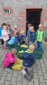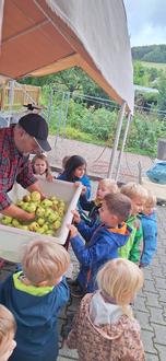 Nachdem die Säcke gefüllt sind, tragen die Kinder ihre Ernte zu Harald Wallewein. Er ist im Ort bekannt dafür, dass er in seiner Freizeit mit viel Leidenschaft Apfelsaft herstellt. „Das ist mein Hobby“ erzählt er lächelnd, während er die schweren Säcke entgegennimmt. „Und das Schönste ist, wenn die Kinder dabei mithelfen.“