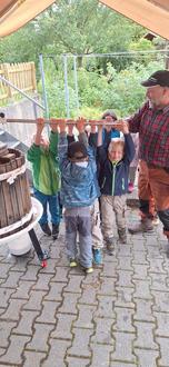 Dann folgt der spannendste Moment- Das Pressen: Das zerkleinerte Obst wird in eine robuste Spindelpresse gefüllt. Gemeinsam legen die Kinder Hand an und drehen den schweren Presshebel herunter. Der Druck presst das Fruchtmus zusammen, und langsam beginnt der goldene Saft herauszulaufen. “Schaut mal, jetzt tropft es!“, jubeln die Kinder, als die ersten Strahlen Saft in den Auffangbehälter fließen.