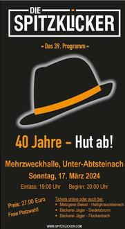 Aber Weinheims Kabarettisten feiern ihr Jubiläumsprogramm „40 Jahre – Hut ab!“ mit ihrem treuen Publikum insgesamt an 40 Abenden u. a. auch in Unter-Abtsteinach.