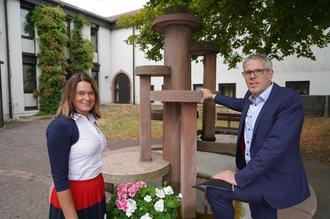 Bildunterschrift: Auch über die Situation der Kinderbetreuung in Abtsteinach machte sich Landrat Christian Engelhardt (li.) - hier am Brunnen vor dem Abtsteinacher Rathaus - zusammen mit Bürgermeisterin Angelika Beckenbach ein Bild.