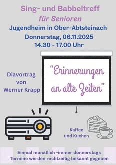 Nachdem bei der letzten Zusammenkunft im Oktober, ganz der Jahreszeit entsprechend, bei Neuem Wein und Zwiebelkuchen ausgiebig gesungen und gebabbelt wurde, steht am Donnerstag, dem 06. November, ein ganz anderer, sehr interessanter Punkt auf dem Programm. Werner Krapp präsentiert im Verlaufe des Nachmittags einen Diavortrag und zeigt alte Bilder aus Abtsteinach. Damit hatte er bereits 2023, beim Jubiläum und einer Projektwoche des Bildhauers Martin Hintenlang, einen Riesenerfolg. Er weckt damit bei den Teilnehmerinnen und Teilnehmern des „Sing- und Babbeltreffs“ sicher viele Erinnerungen an frühere Zeiten, die ganz bestimmt für reichlich Gesprächsstoff sorgen werden.