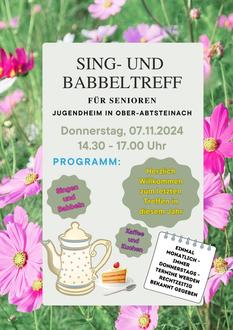 Der nächste und letzte „Sing- und Babbeltreff“ des Jahres 2024 findet am Donnerstag, dem 07. November, statt. Dann treffen sich die Abtsteinacher Senioren wieder um 14:30 Uhr im Nebenraum des Jugendheims in Ober-Abtsteinach und es darf einmal mehr gesungen und gebabbelt werden. Auch Kaffee und Kuchen sind wieder im Angebot.