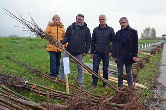 (v.l.n.r.) Ute Schollmaier (für die Obstbaumaktion zuständige Projektleiterin bei der Abteilung „Ländlicher Raum“ der Kreisverwaltung), Florian Schumacher (von der Initiative Streuobstwiesenretter), Thomas Renkert (Leiter der Abteilung „Ländlicher Raum“ in der Kreisverwaltung), und Ulrich Androsch (Geschäftsführer Gewässerverband Bergstraße) bei der Obstbaumabholung.