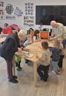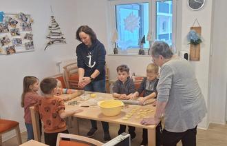 Strahlende Kinderaugen und glückliche Senioren Gesichter: In der Adventszeit liegt im Betreuten Wohnen ein besonderer Zauber in der Luft. Der Waldkindergarten "Wirbelwind" hat sich kürzlich auf den Weg gemacht, um gemeinsam mit den Bewohnerinnen und Bewohnern Plätzchen zu backen. Die generationsübergreifende Aktion sorgte für viel Freude und vorweihnachtliche Stimmung. Schon beim Betreten der Einrichtung wurden die kleinen Bäckerinnen und Bäcker herzlich empfangen. Die Küche verwandelte sich schnell in eine emsige Weihnachtsbäckerei. Der Teig, der von den Eltern bereits vorbereitet worden war, wurde von den Kindern mit Begeisterung ausgerollt und mit Förmchen in Sterne, Herzen und Tannenbäume verwandelt.