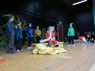 Die kleine Theatergruppe, die sich seit Beginn des Schuljahres im Rahmen der Nachmittags-AG jede Woche getroffen hat, führte in der schulinternen Adventsfeier die Geschichte des eiligen Weihnachtsmannes vor.