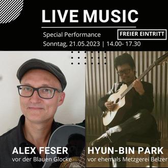 Vor der Blauen Glocke und vor der ehemaligen Metzgerei Belzer gibt’s was auf die Ohren. Ab 14 Uhr werden Gitarrist Alex Feser& Kollegen in die Saiten klopfen, der Musiker Hyun Bin Park sorgt mit Gypsy Swing für Stimmung.