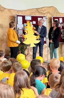 Die Grundschulkinder begleiteten das Richtfest musikalisch und freuten sich über einen Regen aus Bonbons und Süßigkeiten, der nach dem Richtfest-Spruch auf sie niederprasselte. Bis Ostern 2025 sollen die neuen Räume bezugsfertig sein.