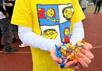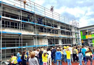Die Grundschulkinder begleiteten das Richtfest musikalisch und freuten sich über einen Regen aus Bonbons und Süßigkeiten, der nach dem Richtfest-Spruch auf sie niederprasselte.