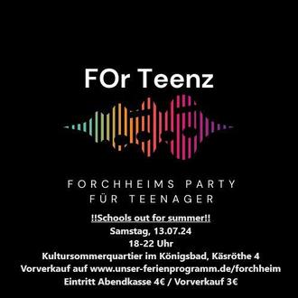 Es darf wieder gefeiert werden! Die zweite Runde der FOr Teenz-Partys kommt. Dieses Mal feiern alle unter freien Himmel im Kultursommerquartier beim Königsbad Forchheim. „Schools out for summer!“ heißt das Motto, mit dem die letzte Schulwoche eingeleitet wird. Teenager im Alter von 13 bis 18 Jahren sind herzlich willkommen, zu feiern, zu tanzen und das alte Schuljahr zu verabschieden.