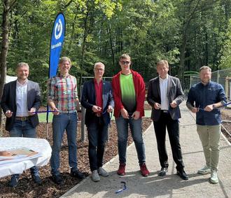 Zur Einweihung wird feierlich ein blaues Band durchschnitten. Mit dabei: Oberbürgermeister Dr. Uwe Kirschstein (3.v.l.) und Landrat Dr. Hermann Ulm (2.v.r.).