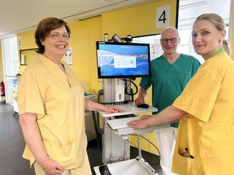 Dr. Judith Neglein, Dr. Ágnes Ujvári und Chefarzt Dr. Ulrich von Hintzenstern mit der neuen Telemedizin-Station auf der Intensivstation im Klinikum Forchheim