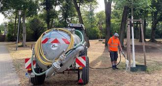Besonders die jungen, neu gepflanzten Bäume brauchen viel Wasser: Mit 200 Litern des kühlen Nass‘ wird jeder Baum einmal in der Woche versorgt, drei Fahrzeuge sind im Dauereinsatz und gießen Tag für Tag rund 25000 Liter Wasser.