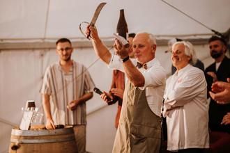 • Showact bei der Eröffnungsgala: Eine besondere Art, die Weinflasche zu öffnen! Im Hintergrund rechts Spitzenkoch Bernhard Reiser, links Nico Cieslar, Leiter des Amts Marketing, Tourismus & internationale Beziehungen.