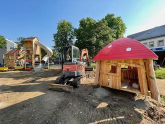 Die Bagger rollen noch. Im Vordergrund das Spielhäuschen mit rotem Fliegenpilz-Dach.