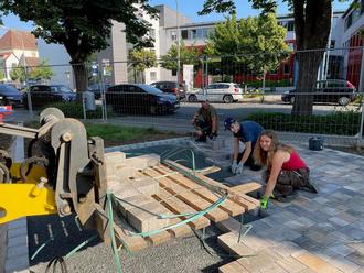 Noch viel zu tun: Die Auszubildenden der Stadt helfen fleißig beim Pflastern.