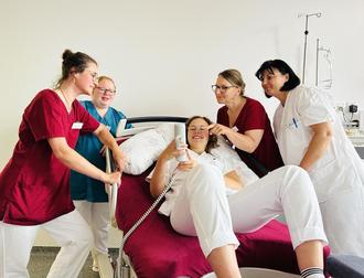Dr. Weingärtler und erklärt den wohl wichtigsten Vorteil im Vergleich zu herkömmlichen Betten: „Mit Hilfe des bewegten Geburtsbettes können Gebärende leichter verschiedenen Positionen einnehmen.“ Wissenschaftliche Studien hätten gezeigt, dass mehr Bewegung bei der Geburt zu kürzeren Geburtsdauern, weniger ungeplanten Kaiserschnitten und geringerem Schmerzmittelbedarf führt. „Jede Frau und jede Geburt ist einzigartig. Mit dem neuen Geburtsbett, das von Schweizer Hebammen entwickelt worden ist, können wir aktive Bewegungen in allen Phasen kontinuierlich unterstützen“, so der Chefarzt, der darauf verweist, dass klinische Studien bewiesen hätten, dass 90 Prozent der Frauen mit dem bewegten Geburtsbett eine deutlich entspanntere Geburt erleben. „Neben der persönlichen und individuellen Begleitung durch die Hebamme unterstützt die,bewegte Matratze` den natürlichen Geburtsvorgang“, freut sich auch Martina Steck als leitende Hebamme. „Wir haben das neue Geburtsbett jetzt seit zwei Wochen und machen damit sehr viel positive Erfahrungen. Die Schwangeren freuen sich zum Beispiel über das sanfte Beckenwiegen während der regelmäßigen Kontrolle der kindlichen Herztöne. Viel Lob bekommt das Bett auch, weil es besonders bequem ist und so auch ein kleines Schläfchen zwischendurch ermöglicht“, berichtet Martina Steck weiter. Das Klinikum Forchheim-Fränkische Schweiz setze mit der Investition in das neue Vibwife- Geburtsbett nicht nur auf medizinische Innovationen, sondern auch auf die enge Zusammenarbeit zwischen allen beteiligten Berufsgruppen, um den werdenden Eltern und ihren Kindern einen bestmöglichen Start ins Leben zu ermöglichen.