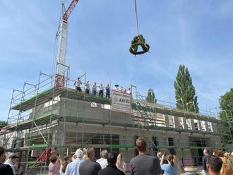 Die Zeitkapsel ist sicher verstaut, der Richtspruch des Zimmerers gesprochen: An der KiTa Merowingerstraße wurde Grundsteinlegung und Richtfest gefeiert!