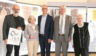 V.l.n.r.: Erik Buchholz, Vorsitzender des Heimatkreises Braunau/ Sudetenland e.V., Helga Buhl, Heimatkreisrätin - also Mitglied des Partnerschaftskomitees und Dolmetscherin, Oberbürgermeister Dr. Uwe Kirschstein, Prof. Dr. Matthias Stickler und Walter Hecht ist ebenfalls Heimatkreisrat und Gründer, Chefredakteur und Verfasser des „Braunauer Rundbriefes“.