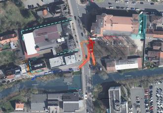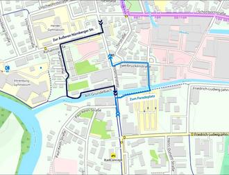 | • | Für den aus dem Süden kommenden Radverkehr verläuft die Umleitung über den Radweg hinter der Bundesagentur für Arbeit, über die Brücke des Gründelbachs und auf die Zweibrückenstraße in Richtung Paradeplatz. |