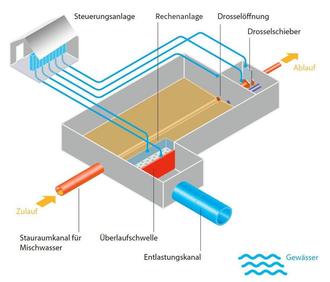 Der Stauraumkanal nimmt eine zentrale Funktion bei der Behandlung von Regenwasser ein, bevor dieses in natürliche Gewässer eingeleitet werden darf. Bei Starkregenereignissen wird der besonders stark verschmutzte erste Abwasserspülschwall im Stauraumkanal zwischengespeichert. Mithilfe der Mess- und Regeltechnik wird eine genau berechnete Menge des Abwassers gedrosselt zur Kläranlage weitergeleitet.