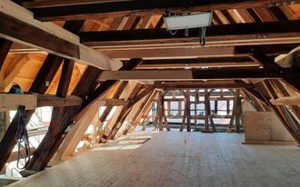 Aktuell erfolgt die Dachsanierung am Hauptbau. Das komplette Schutzdach mit Einhausung des Turms und Sturmsicherung der Giebelwände ist fertig gestellt.