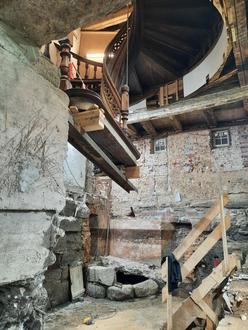 Erhalten bleibt die historische Spindeltreppe, die für die Baumaßnahmen in einen „Schwebezustand“ versetzt wurde.