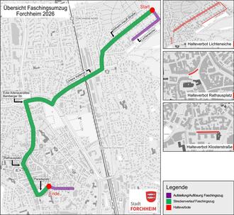 Das Straßenverkehrsamt der Stadt Forchheim gibt bekannt, dass es am Sonntag, den 15. Februar 2026 wegen des Faschingszuges in der Zeit von ca. 12:30 Uhr bis ca. 16 Uhr im Stadtgebiet Forchheim zu Gesamtsperrungen des Verkehrs, Umleitungen, Halteverboten und Geschwindigkeitsbeschränkungen kommt.