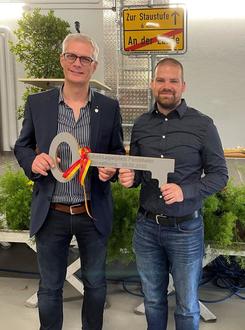 Oberbürgermeister Dr. Uwe Kirschstein übergibt symbolisch der Schlüssel für das neue Bauhofareal an Amtsleiter Christian Höhn