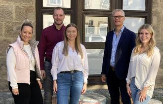 V.l.n.r.: Amtsleitung Claudia Uhlig, Referatsleitung Richard Reickersdorfer, die frisch gebackene Erzieherin Annika Fietzeck, Oberbürgermeister Dr. Uwe Kirschstein und Praxisanleiterin Lilly Schneider.