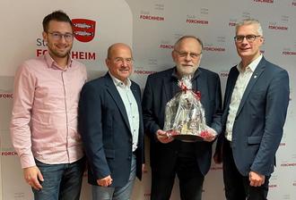 Abschied: V.l.n.r. Nico Cieslar, Partnerschaftskoordinator Stadt Forchheim, der neue Partnerschaftsbeauftragte Holger Lehnard, der scheidende Partnerschaftbeauftragte Ulli Welz, Oberbürgermeister Dr. Uwe Kirschstein.