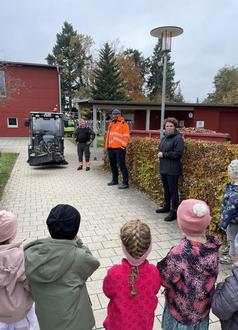 Mit leuchtenden Augen standen die Kleinen im Hof des Kindergartens Spalier und beobachteten ganz gespannt die großen rotierenden Bürsten der Kehrmaschine.