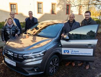 Viel Freude herrscht bei der Ankunft des Hauptgewinns. v.l. Yvonne Kraus und Sören Brandmähl-Kraus vom Autohaus Kraus Erlangen, Oberbürgermeister Dr. Uwe Kirschstein, Alexander Brehm, stv. Vorstandsvorsitzender der VR Bank Bamberg-Forchheim, Nico Cieslar, 1. Vorsitzender des Heimatvereins.