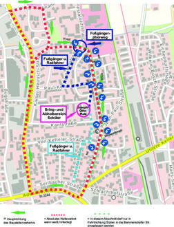 Am Joseph-Otto-Platz (pink markiert) gibt es eine sog. „Kiss & Go“-Zone: Eltern, die ihre Kinder mit dem Auto zur Schule bringen, werden dringend aufgefordert, ihre Kinder hier aussteigen zu lassen, um eine Staubildung im Baustellenverkehr zu vermeiden. Der oben beschriebene, rund 200 Meter lange Fußweg zur Schule ist gesichert und auch für junge Schüler*innen zumutbar. Von einer direkten Anfahrt mit dem Pkw in das Schulzentrum in der Pestalozzistraße in Richtung Norden über die Bammersdorfer Straße wird aus Sicherheitsgründen dringend abgeraten, zumal in der Bammersdorfer Straße nicht gehalten werden darf!