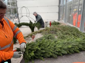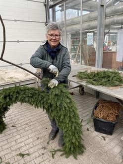Fichtengrün schneiden, zu Kronen und Girlanden binden, aufbauen, transportieren, dekorieren, abbauen: Es sind viele Handgriffe nötig, bis die traditionellen Osterbrunnen im Stadtgebiet Forchheims Einheimische und Gäste aus Nah und Fern gleichermaßen erfreuen! Momentan sind die Mitarbeiter*innen des Gartenamtes damit beschäftigt, die klein geschnittenen Zweige um große metallene Rahmen kunstvoll zu binden.