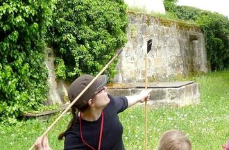 Ganz weit zurück in die Geschichte geht die Zeitreise, bei der natürlich auch die Höhlenmalerei nicht fehlen darf, ein wenig Schmuck aus Bast und Muscheln gefertigt wird und anschließend mit nach Hause genommen werden darf. Die Atlatl, das ist ein Wurfspeer, kann als eine der ersten vom Menschen entwickelten und gebrauchten Jagdwaffen angesehen werden. Im Pfalzgraben können die Teilnehmer*Innen das Werfen mit dem Wurfspeer üben. Und dass es gar nicht so einfach ist, einen Apfel mit einem echten Steinzeitmesser zu schälen, das lernen die Besucherinnen und Besucher auch!