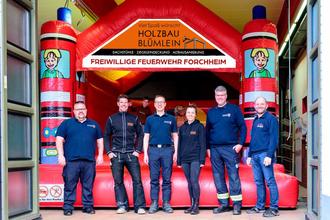 Eine Feuerwehrhüpfburg wird am diesjährigen Florianstag eingeweiht. Mit den Maßen von 5 m x 6 m ist diese universell einsetzbar und wird nicht nur am Florianstag für leuchtende Kinderaugen sorgen, so ist sich stellv. Vorsitzender Peter Pinzel sicher. „Wir sind Philipp und Britta Blümlein von der Forchheimer Firma Holzbau Blümlein sehr dankbar, dass sie die Anschaffung finanziell unterstützt haben“, so Vorsitzender Josua Flierl. Inklusive Zubehör wurden rund 5.000 Euro aus Vereinsmitteln investiert, mittelfristig ist auch angedacht, die Hüpfburg zu verleihen. Auf dem Bild von links: Stellv. Vorsitzender Peter Pinzel, Philipp Blümlein, Vorsitzender Josua Flierl, Britta Blümlein, ZF Michael Dittrich und ZF Burkard Baumgärtner.