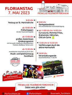 Zum Florianstag lädt die Freiwillige Feuerwehr Forchheim e.V. ein. Neben einem bunten Programm aus Vorführungen und musikalischer Unterhaltung durch die Feuerwehrkapelle Forchheim und den Musik- und Spielmannszug Forchheim ist ein großes Kinderprogramm mit Kinderkarussell geboten. Daneben wird es eine Hüpfburg, eine Fotobox u.v.m. geben.
